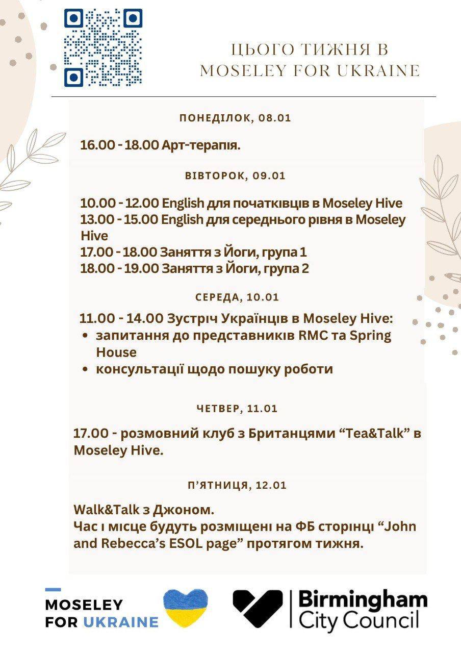 Вашій увазі розклад заходів в Moseley for Ukraine у Бірмінгемі цього тижня: 08.01 – 12.01.24.